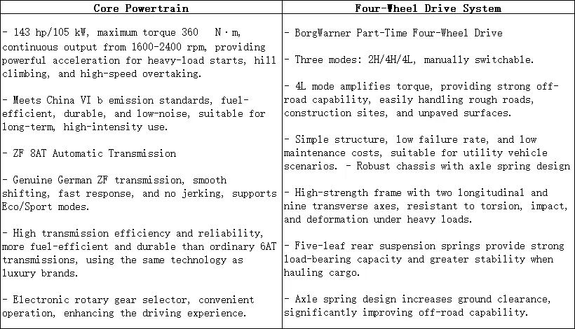 Mẫu 2026 RE-MAX 2.5T tự động 4WD tự hào có những ưu điểm cốt lõi của động cơ diesel Isuzu 2.5T + hộp số ZF 8AT + khung gầm 4WD bán thời gian BorgWarner + HanDun, nhấn mạnh đến tính dễ sử dụng, hệ dẫn động 4WD đáng tin cậy, độ bền cao và phù hợp cho cả gia đình và mục đích thương mại.